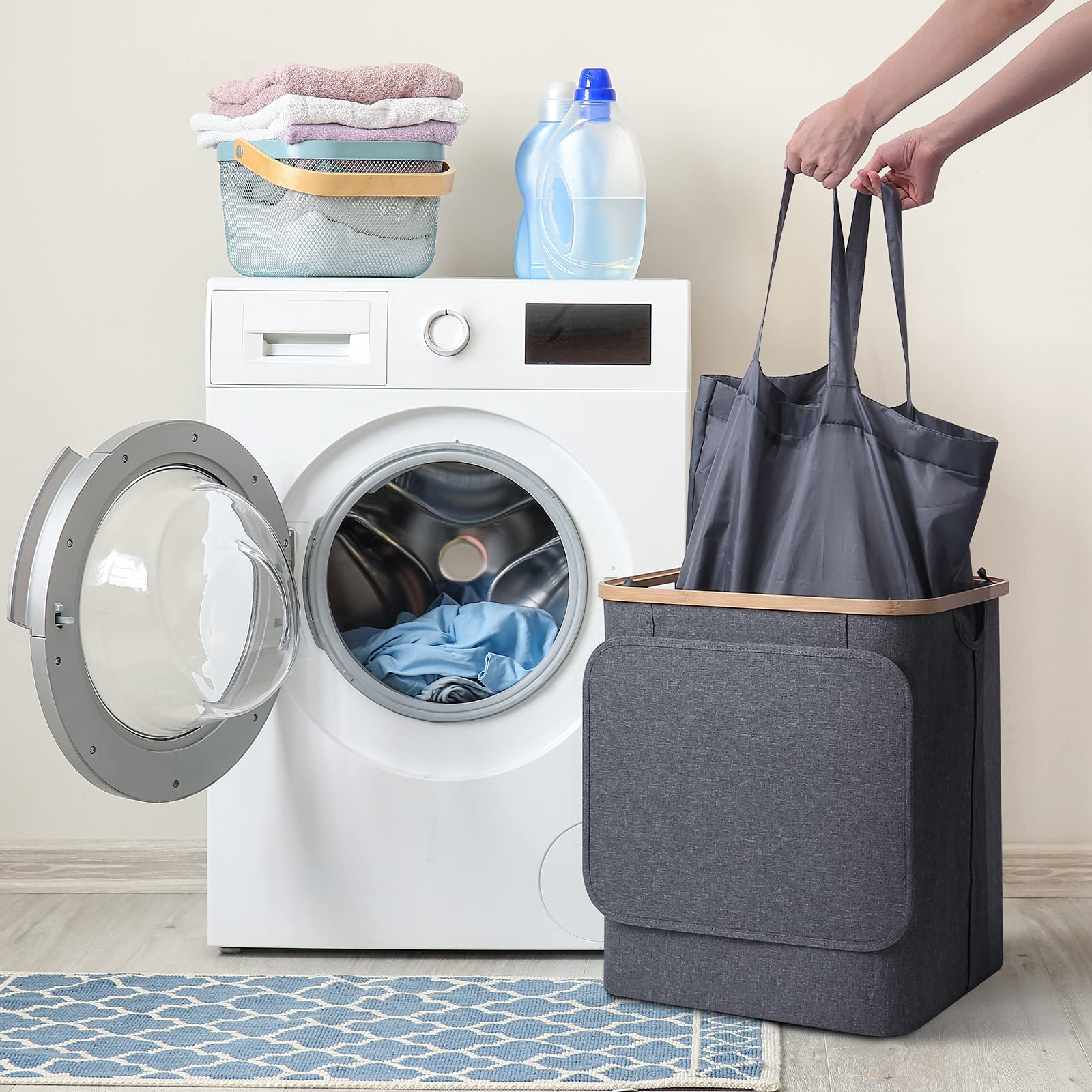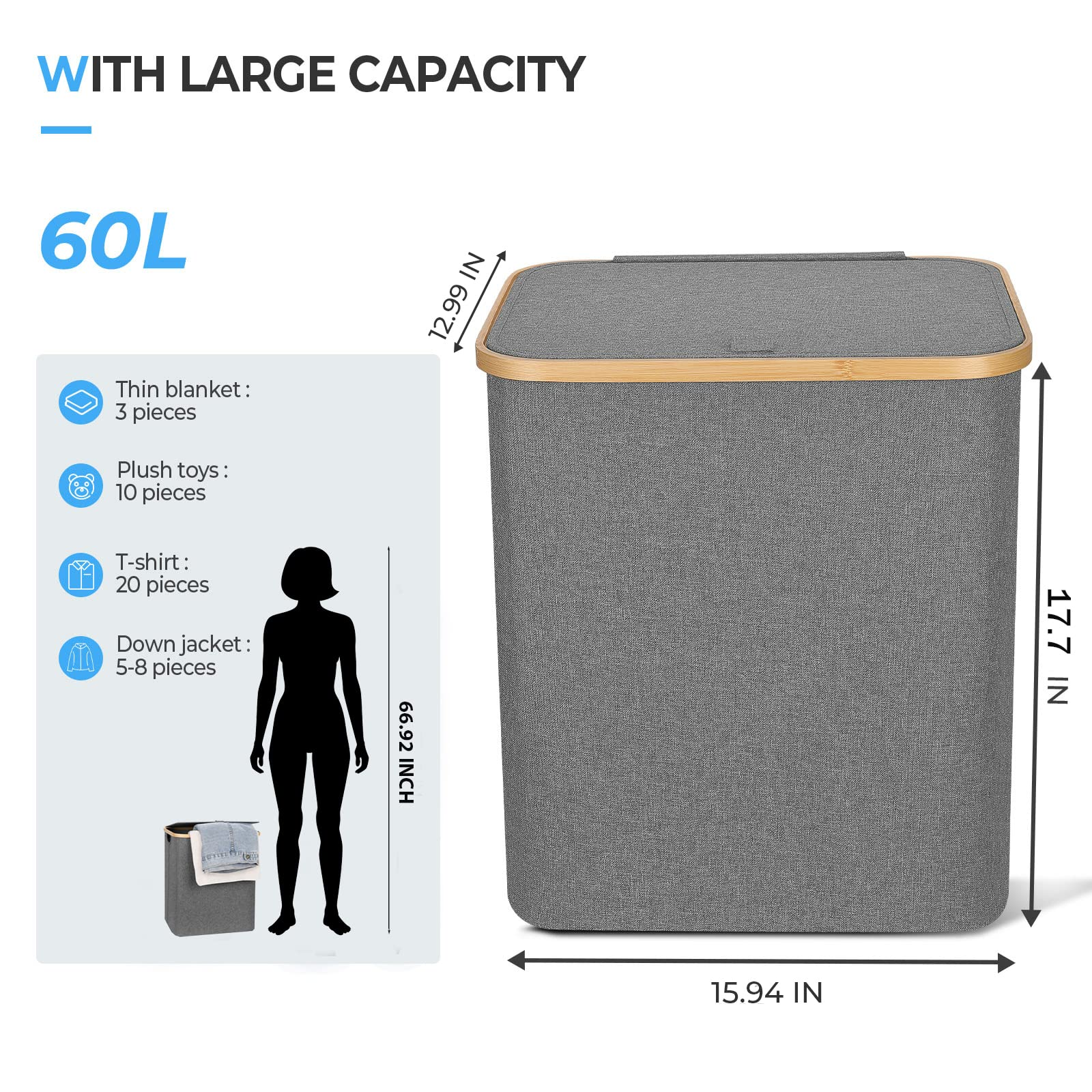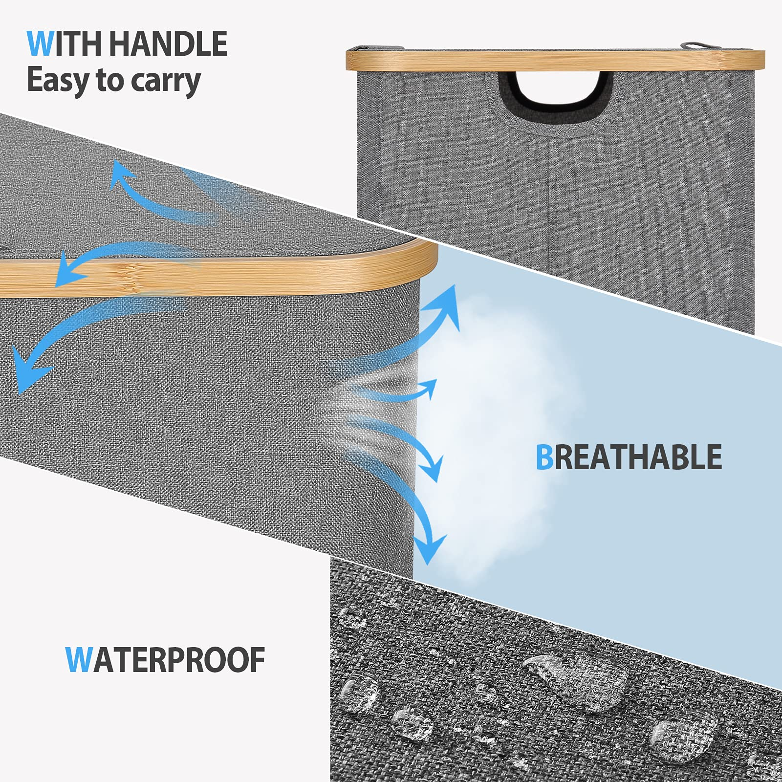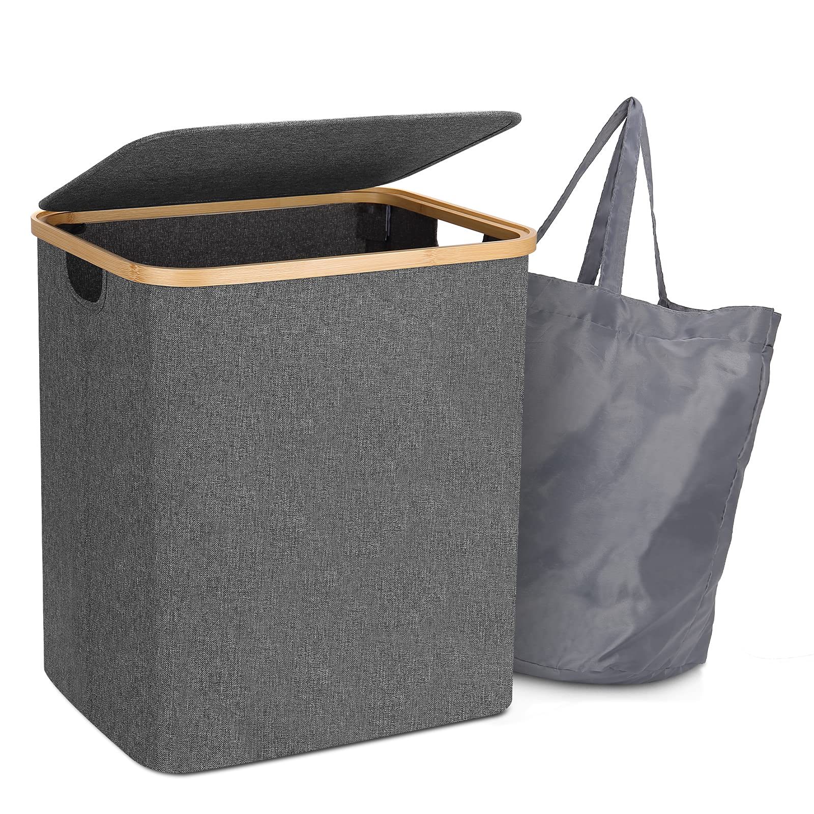 Zuhause / Produkte / Reisetasche / Packwürfel für die Reise / 60L zusammenklappbarer Wäschekorb aus Bambus mit waschbarem Wäschesack, wasserdichter Wäschesortierer für Schlafzimmer, Spielzeug und Kleidung Orga