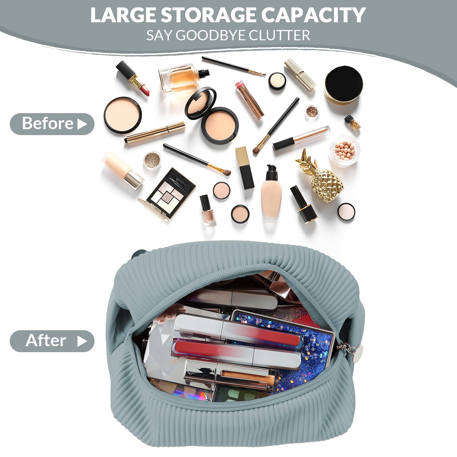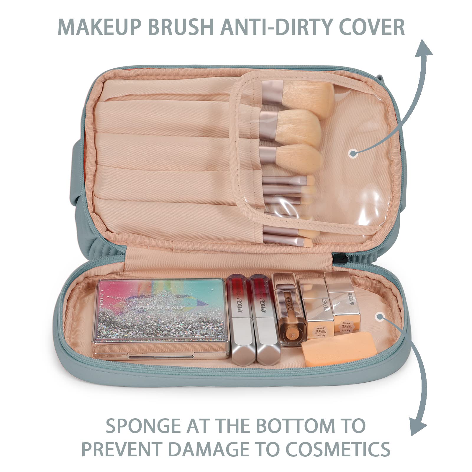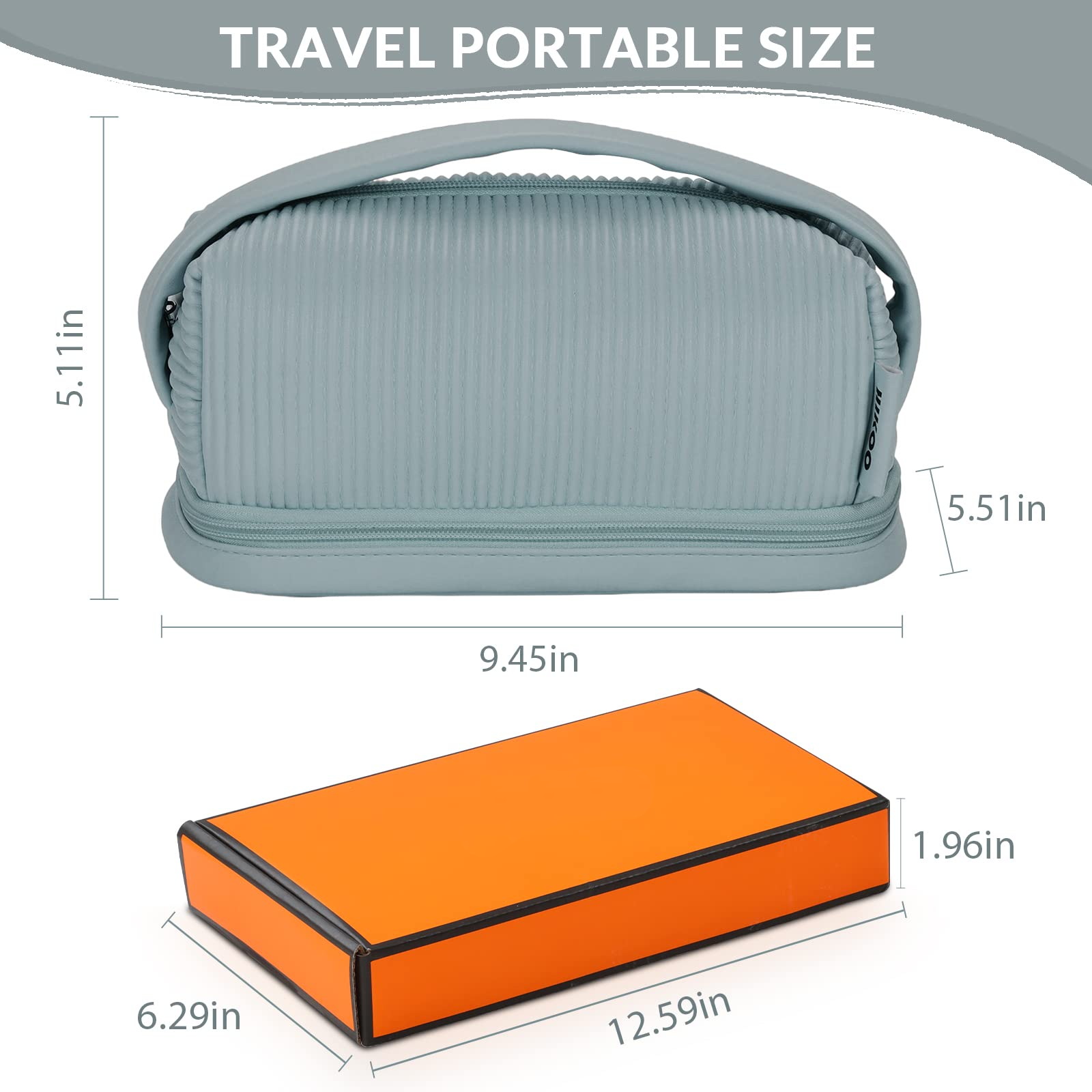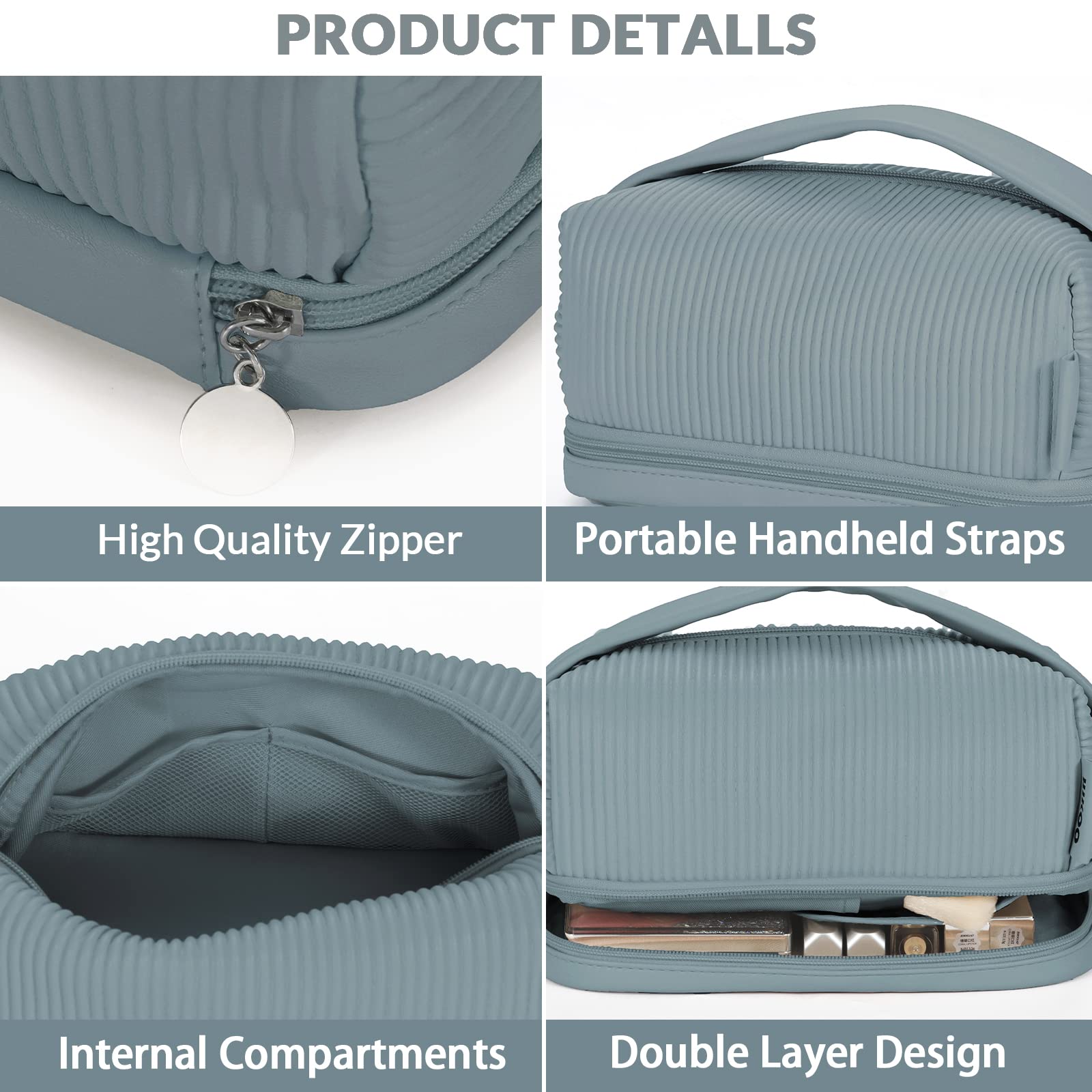 Zuhause / Produkte / Kosmetik- und Kulturtasche / Kosmetiktasche / Doppellagige Reisebürstenfach-Make-up-Tasche für Frauen Make-up für Badezimmer Tragbare blaue Kosmetiktasche mit großer Kapazität