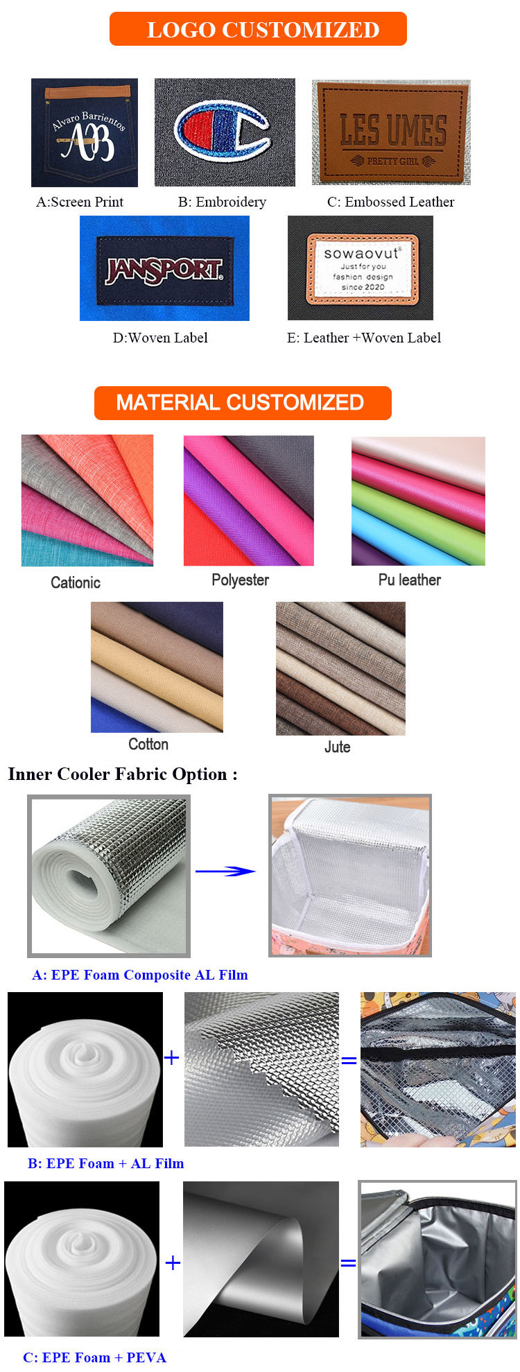 | Material | 600D Polyester + 2 mm Aluminiumfolie oder kundenspezifisches anderes Material | |||