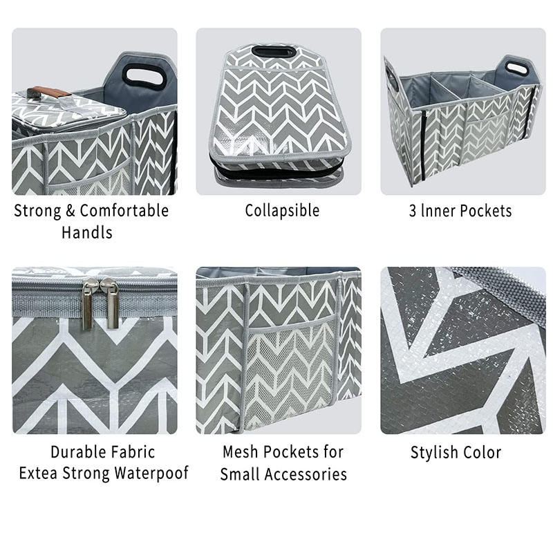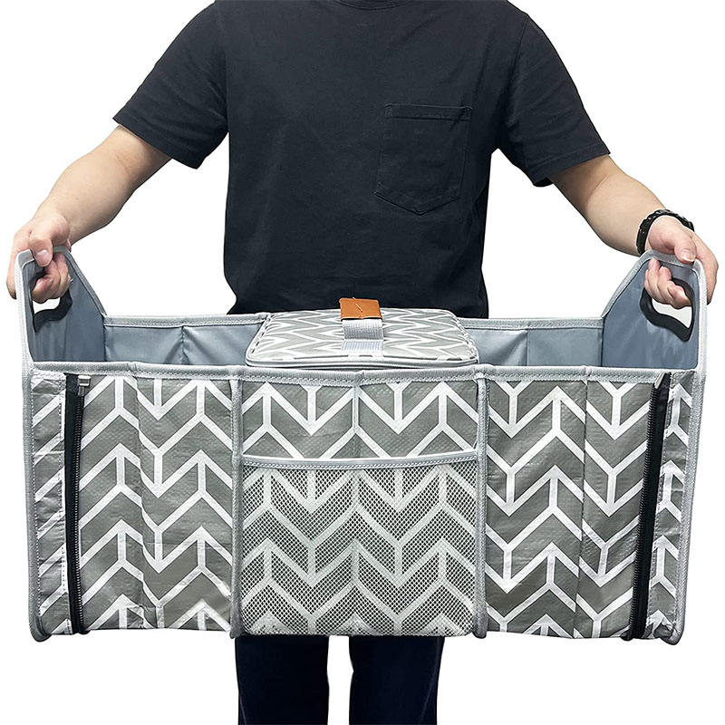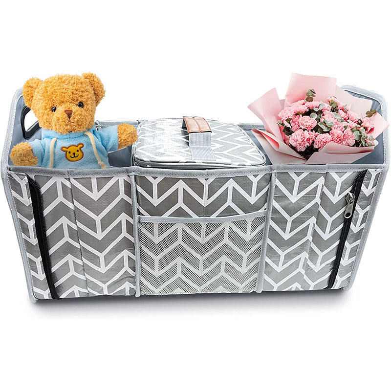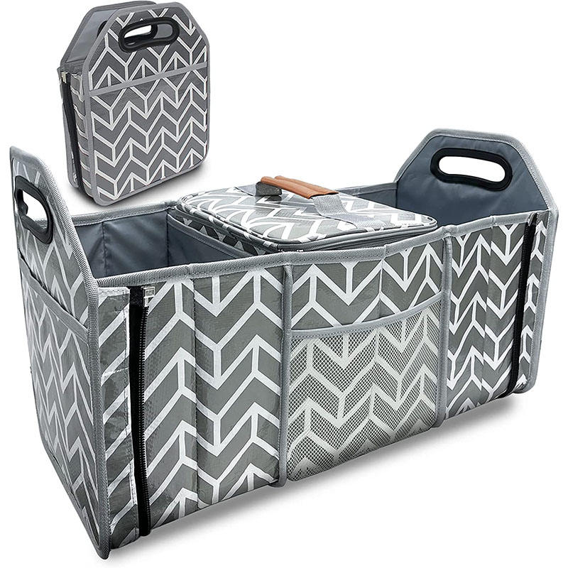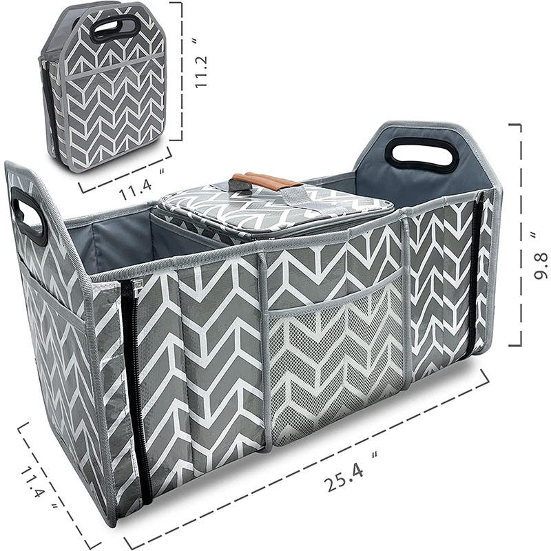 Zuhause / Produkte / Organizer-Tasche / Auto-Organizer / Grauer, faltbarer, großer SUV-Kofferraum-Organizer, Aufbewahrungshalter, Kofferraum-Organizer mit mehreren Fächern und Kühlbox