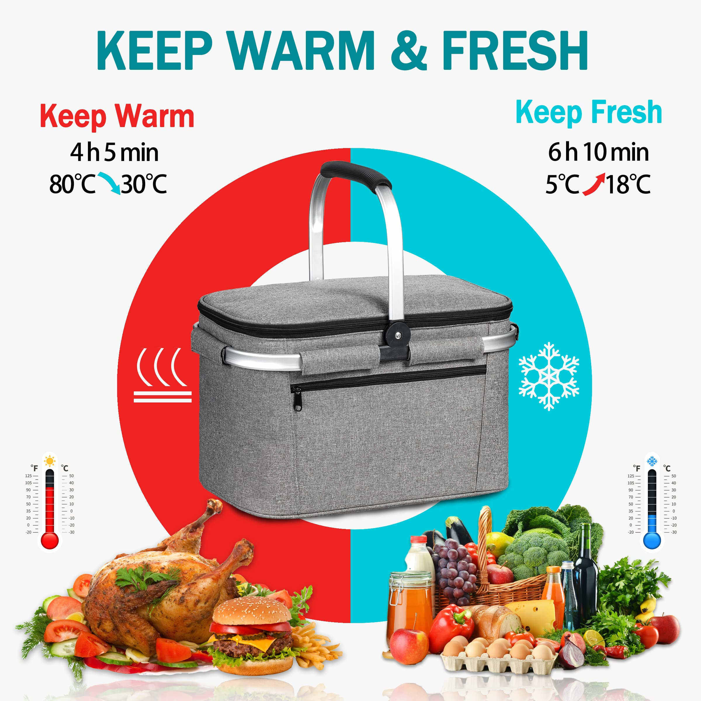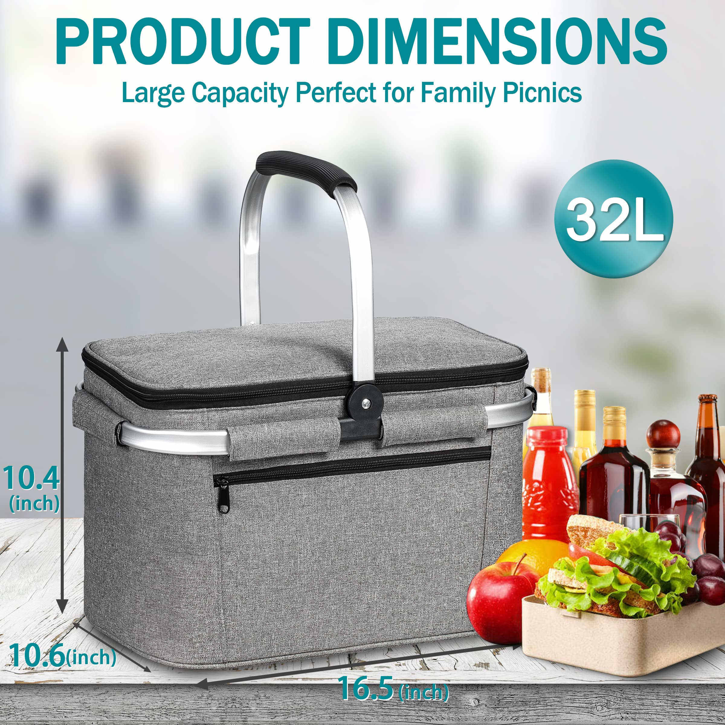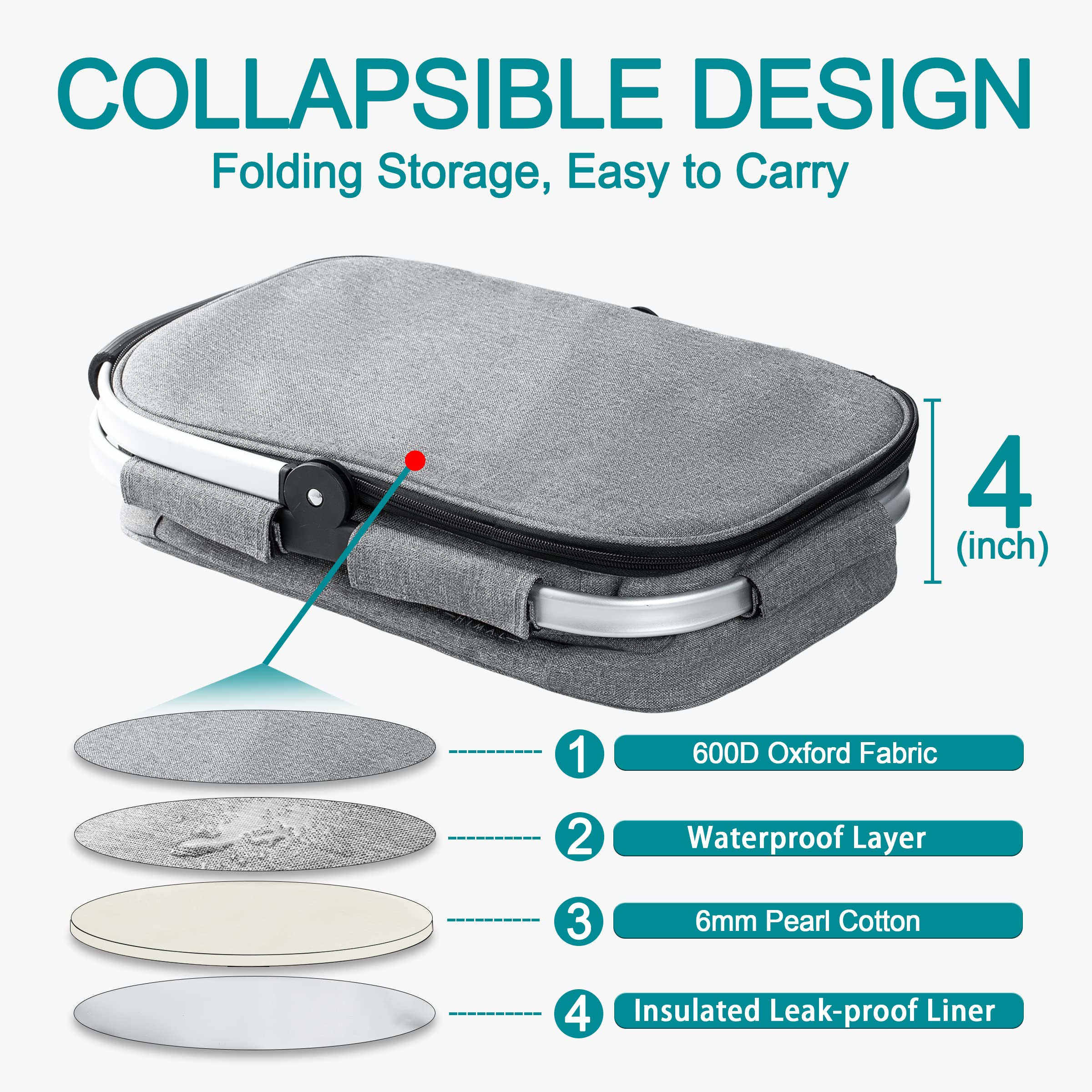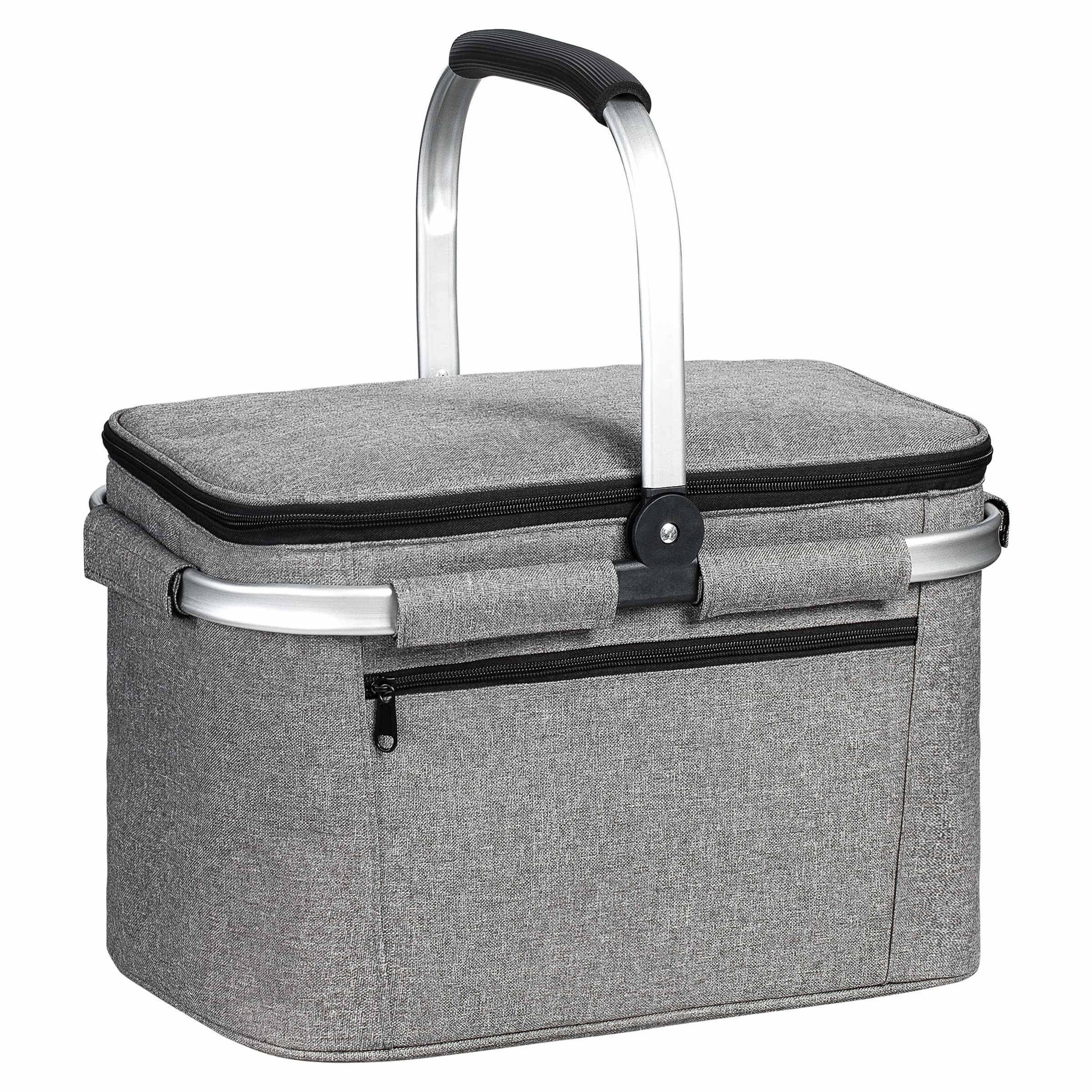 Isolierter Picknickkorb 32 l, tragbar, zusammenklappbar, Wein, Bierdose, Lebensmitteltaschen, auslaufsicherer Kühlkorb zum Einkaufen