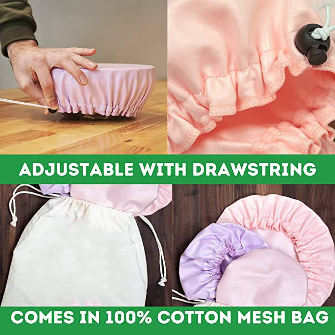 |  Verstellbare, wiederverwendbare Schüsselabdeckungen, wasserdichter Stoff, doppelseitige Kasserollenabdeckungen mit Kordelzug          | |
